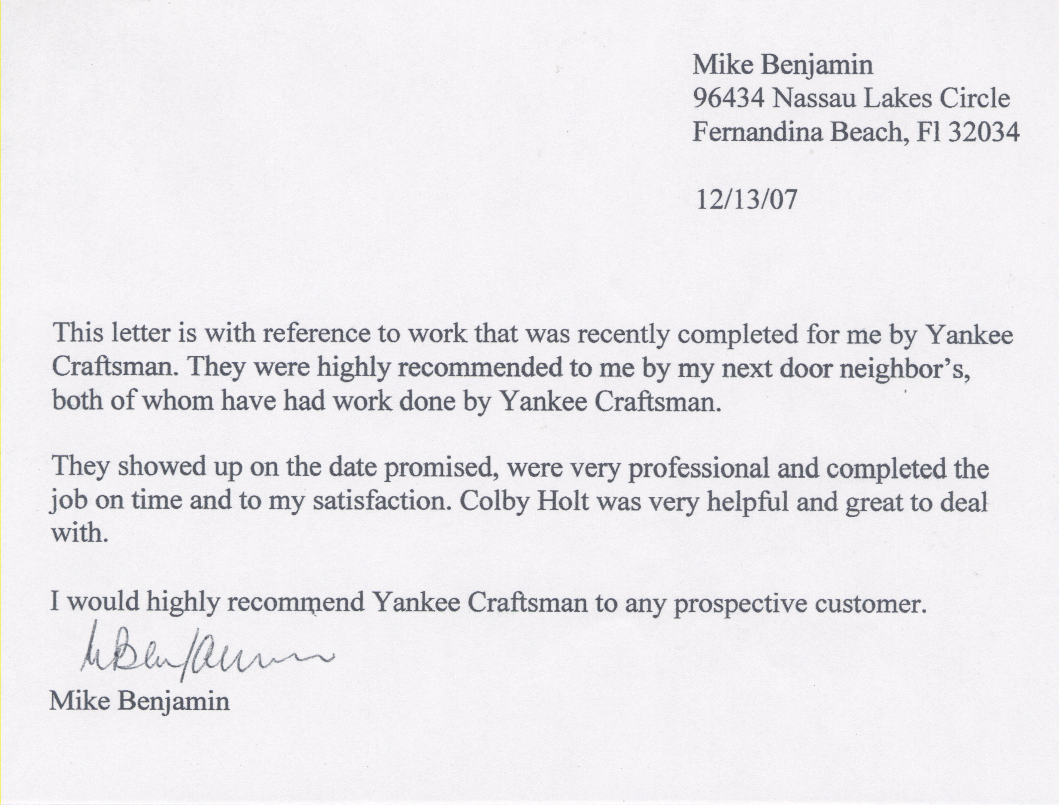 This letter is in reference to work that was recently completed for me by Yankee Craftsman. They were highly recommended to me by my next-door neighbors, both of whom have had work done by Yankee Craftsman .