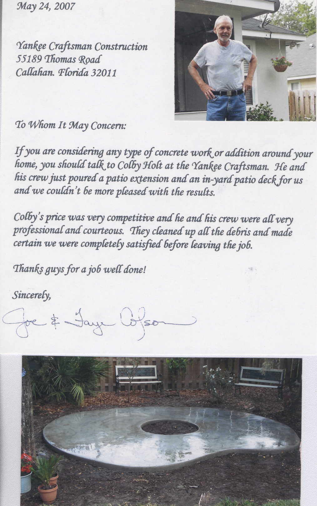 If you are considering any type of concrete work or addition around your home, you should talk to Colby Holt at Yankee Craftsman. He and his crew just poured a patio extension and an in-yard patio deck for us and we couldn’t be more pleased with the results .