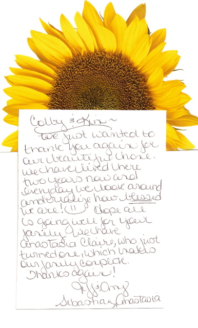 We just wanted to thank you again for our beautiful home. We have lived here two years now and every day we look around and realize how blessed we are! Hope all is going well for your family. We have Anastasia Claire, who just turned one, which makes our family complete.