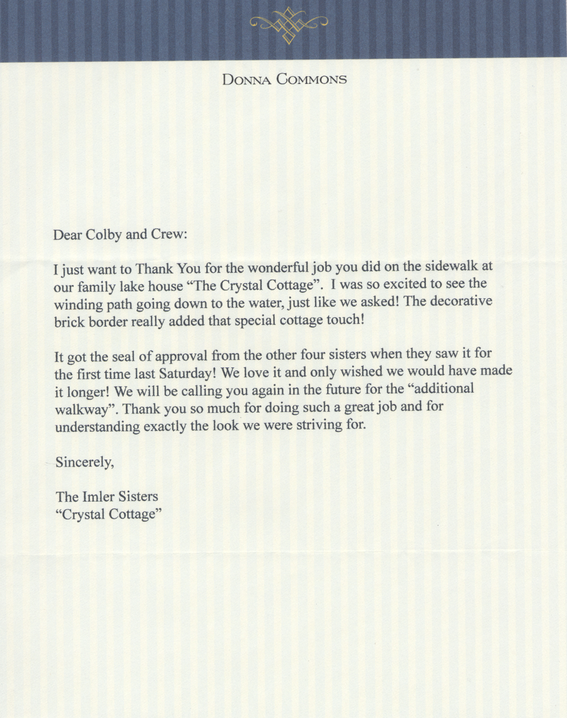 I just want to thank you for the wonderful job you did on the sidewalk at our family lake house “The Crystal Cottage”. I was so excited to see the winding path going down to the water, just like we asked! The decorative brick border really added that special cottage touch!